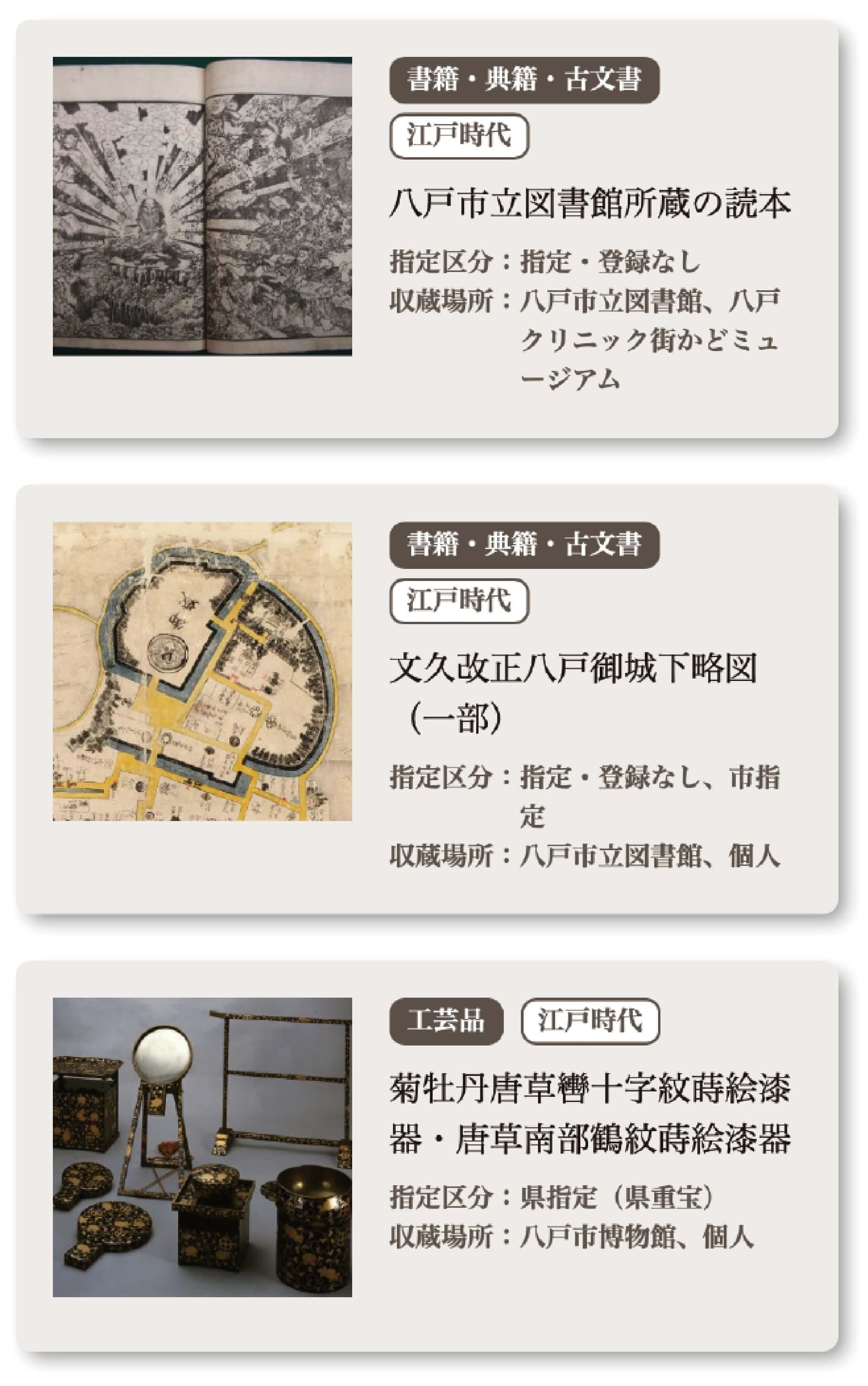 掲載文化財の一覧が表示され、解説文を閲覧できます。また、時代や所蔵先などで文化財を検索することもできます。