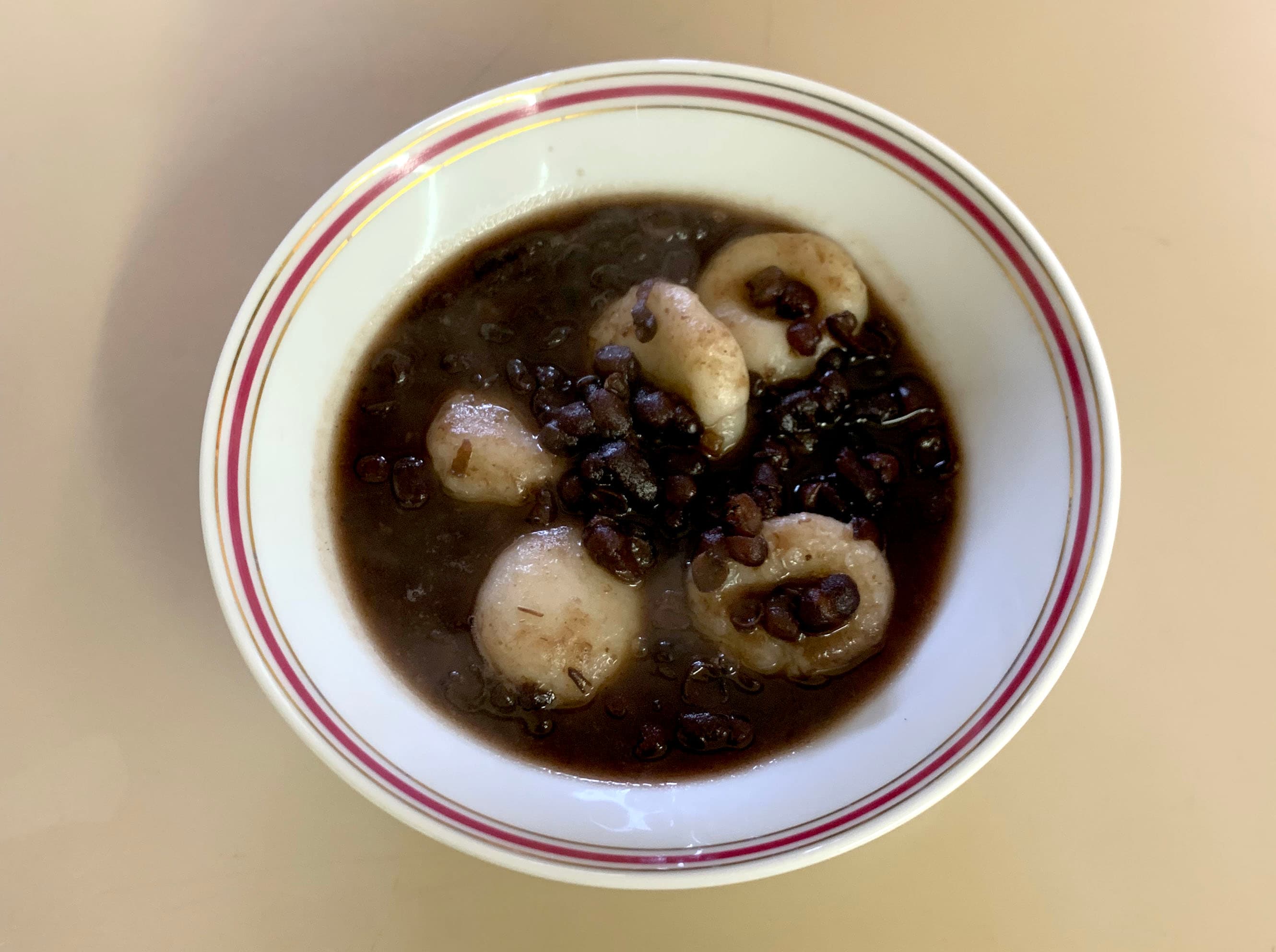 ⑤別鍋に粒あんと水を入れ、沸騰したら団子を入れる。浮かんだら出来上がりなので、味見して甘味を塩加減を調整する。