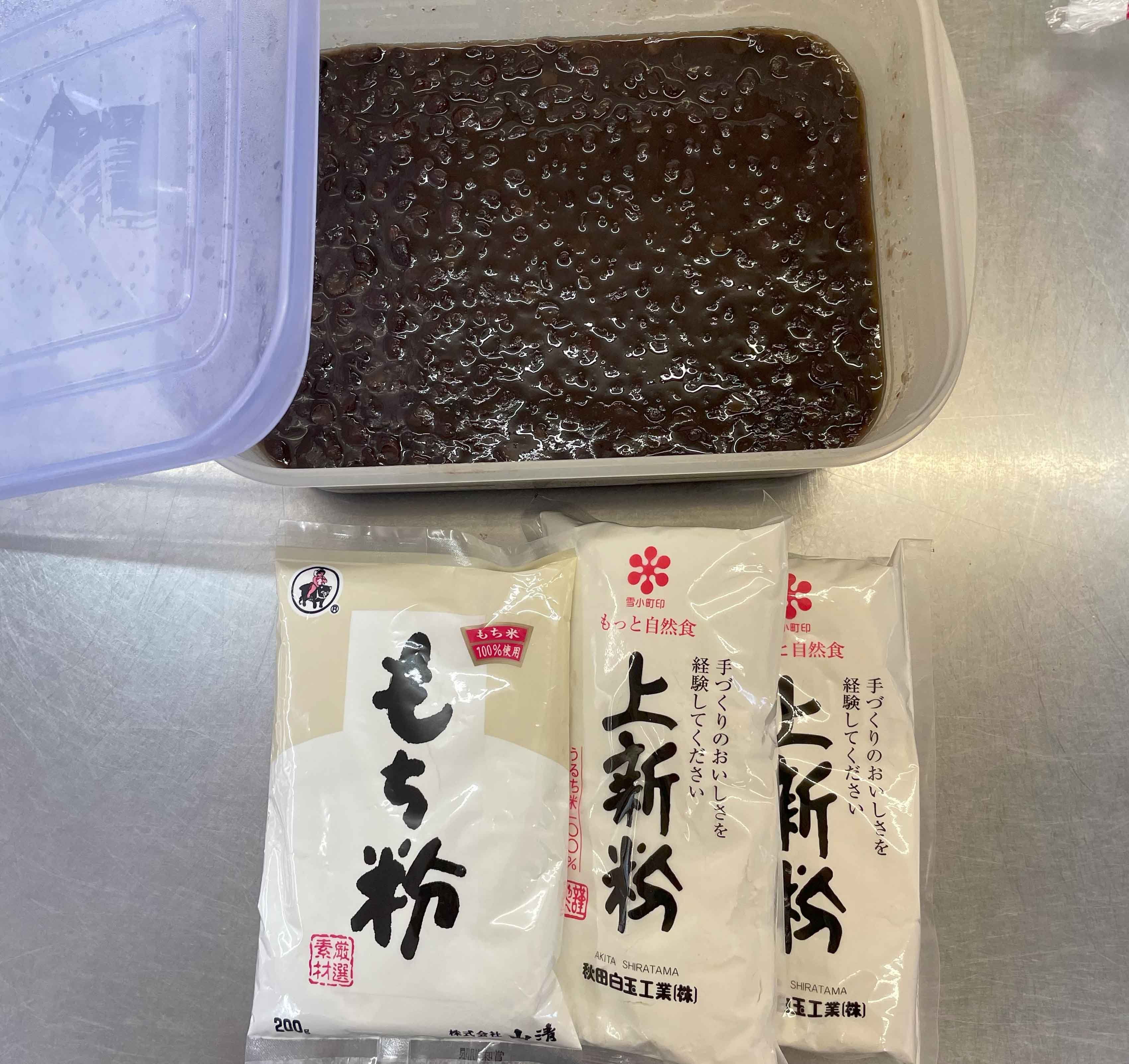 材料(10人分) もち粉 150g 上新粉 150g 熱湯 270cc 打ち粉 適度 粒あん 350g 水 700cc