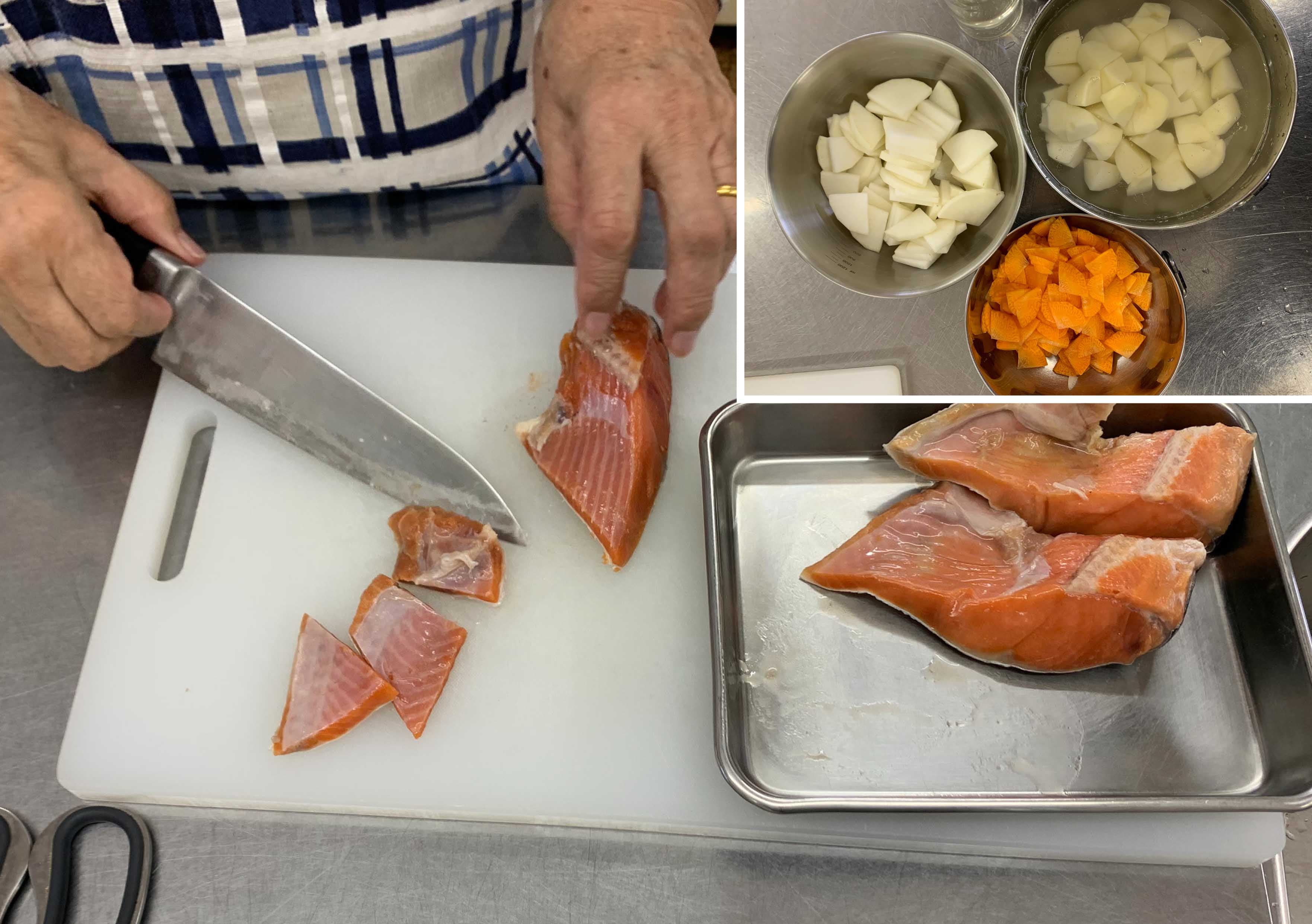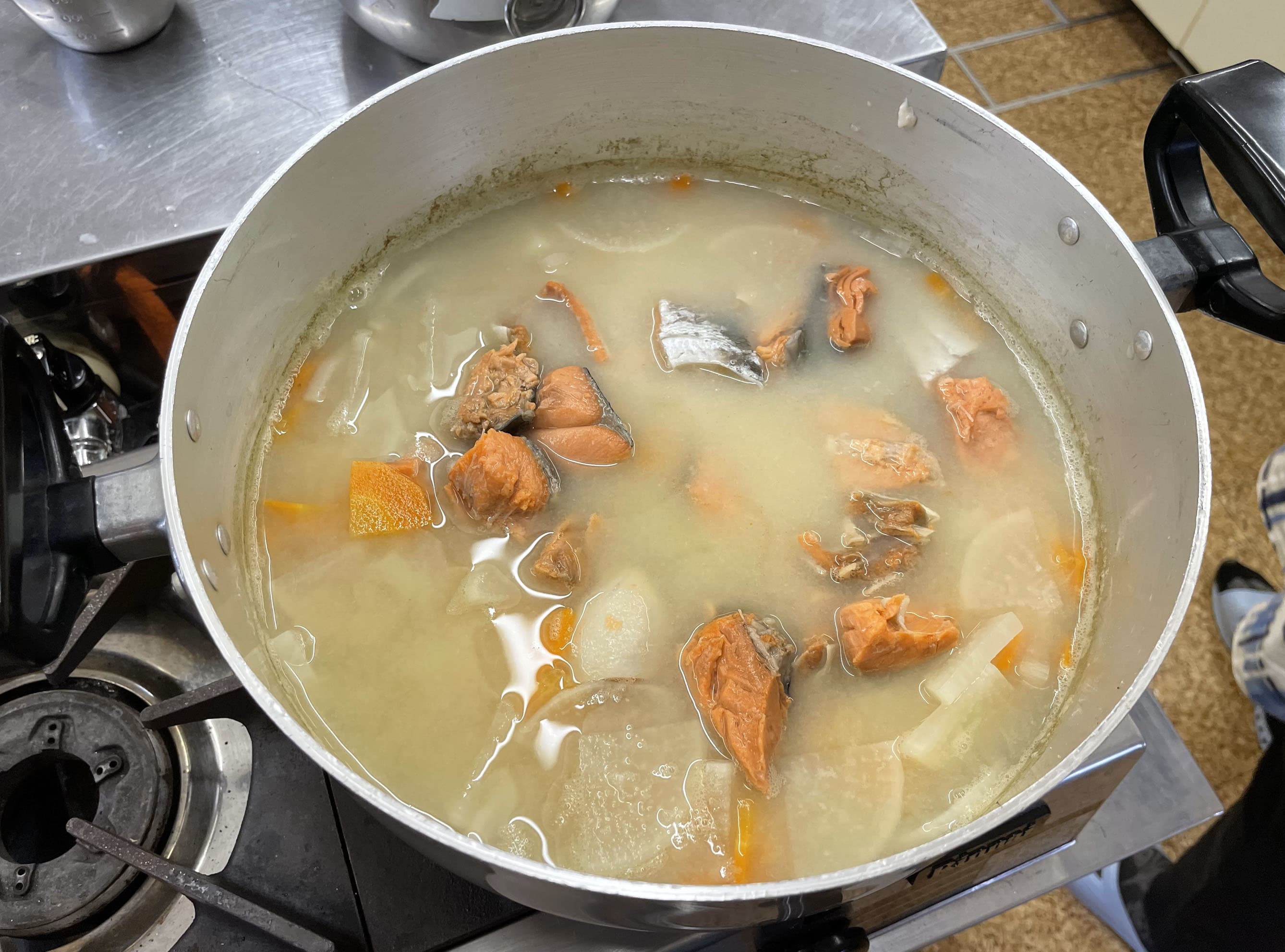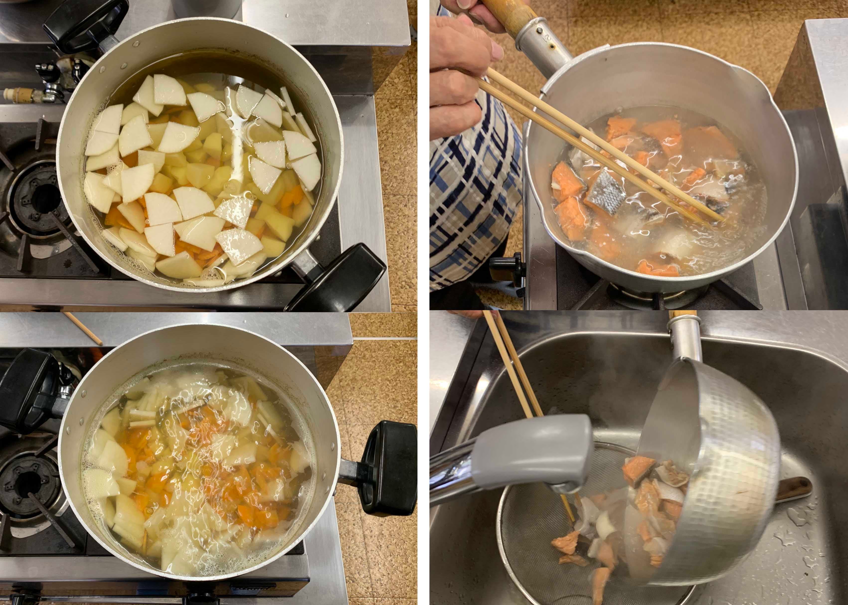 ③鮭は、生臭みをとるため、さっと茹でこぼす。鍋に出汁を入れ、硬い野菜を入れて火が通るまで煮る。