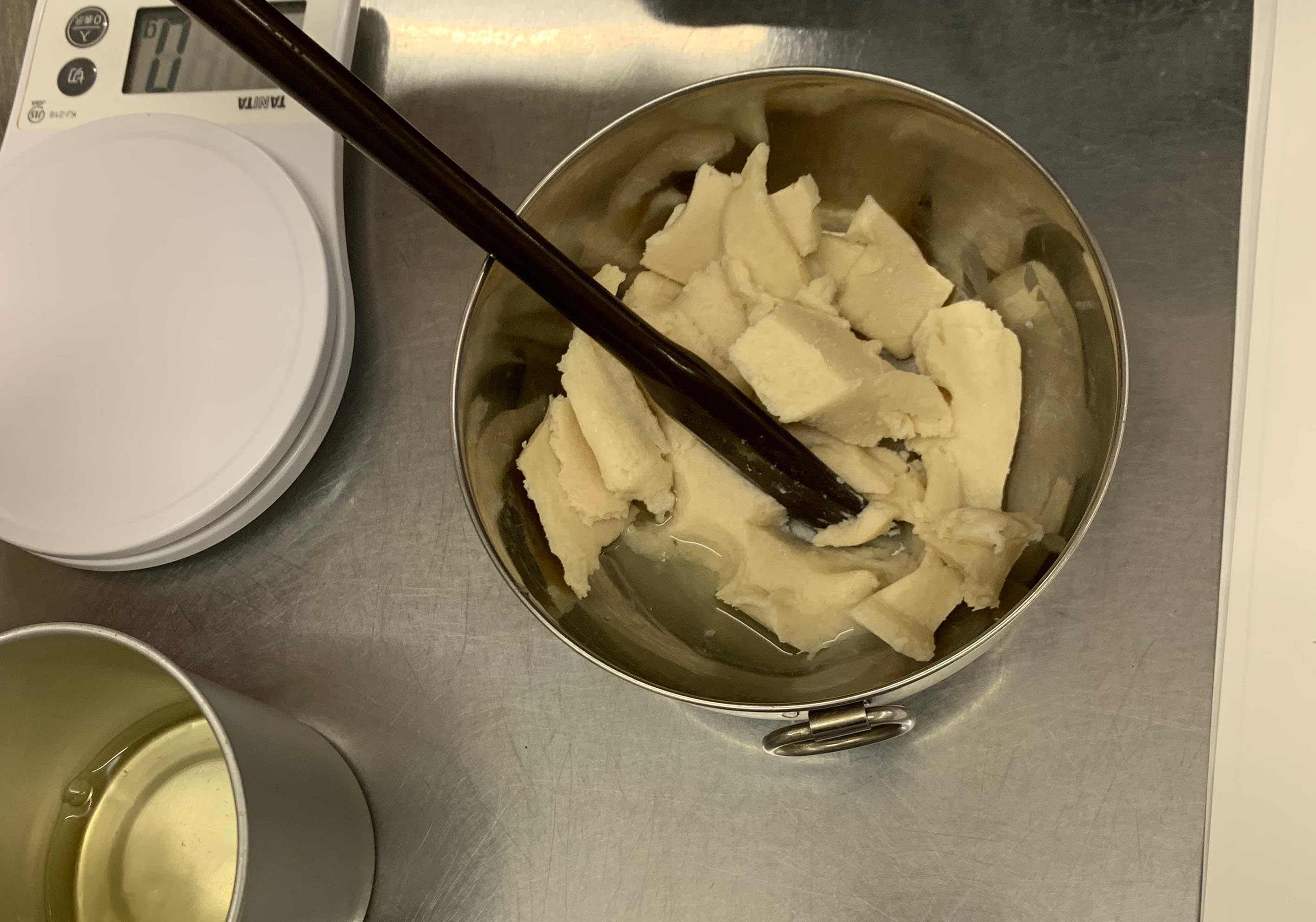 ①酒粕をちぎって、出汁(100㏄位)に30分位つける。