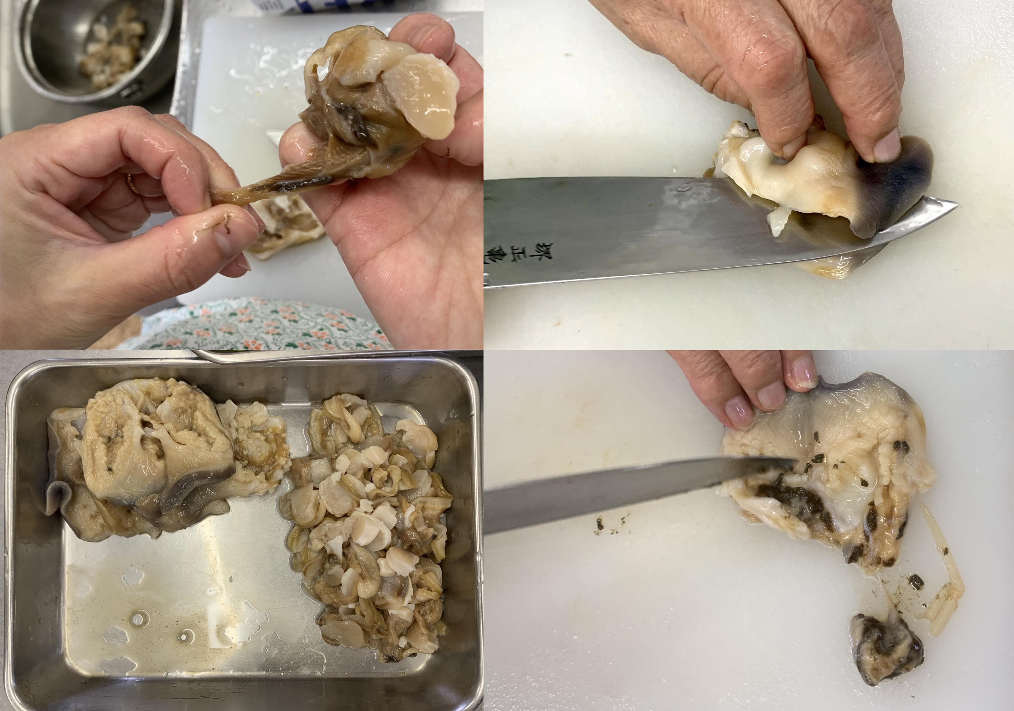 ②(ホッキ貝の下ごしらえ2) 身部分は、包丁を入れ中を開き、黒い部分(内臓)を捨てる。(ここは水で洗うと旨味も落ちるので、包丁と手で分ける。) ひも・貝柱部分は、外側の黒い部分を切り離して捨てる。