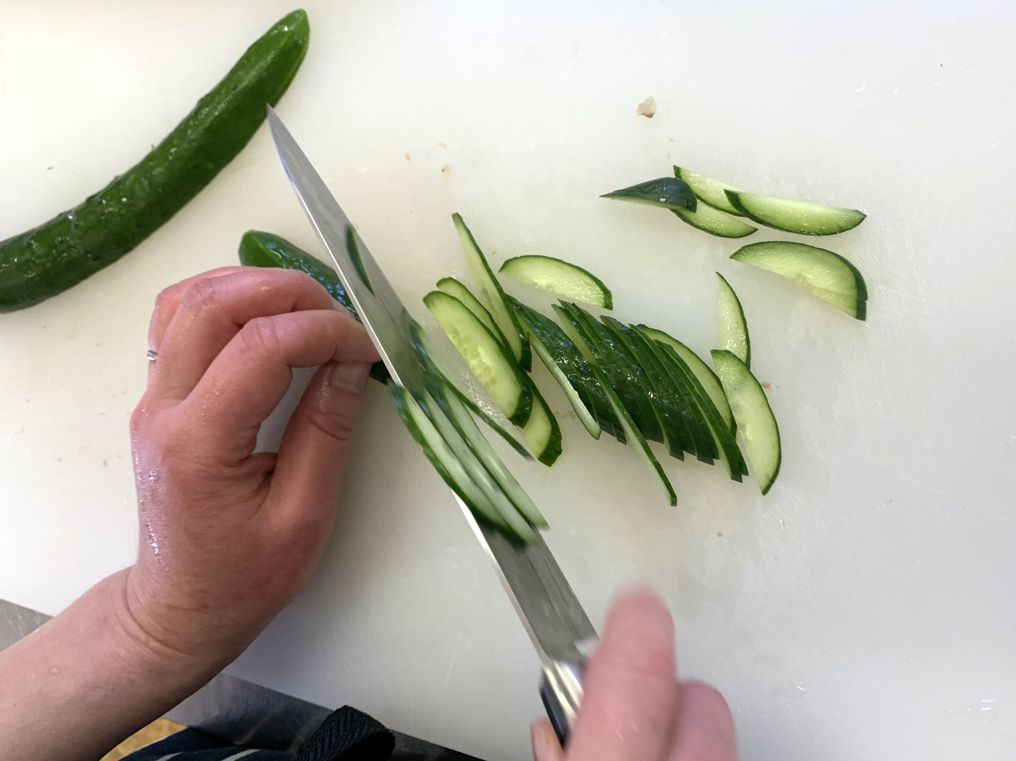 ④きゅうりを薄切りし、塩もみをし、水気が出たら軽くしぼる。