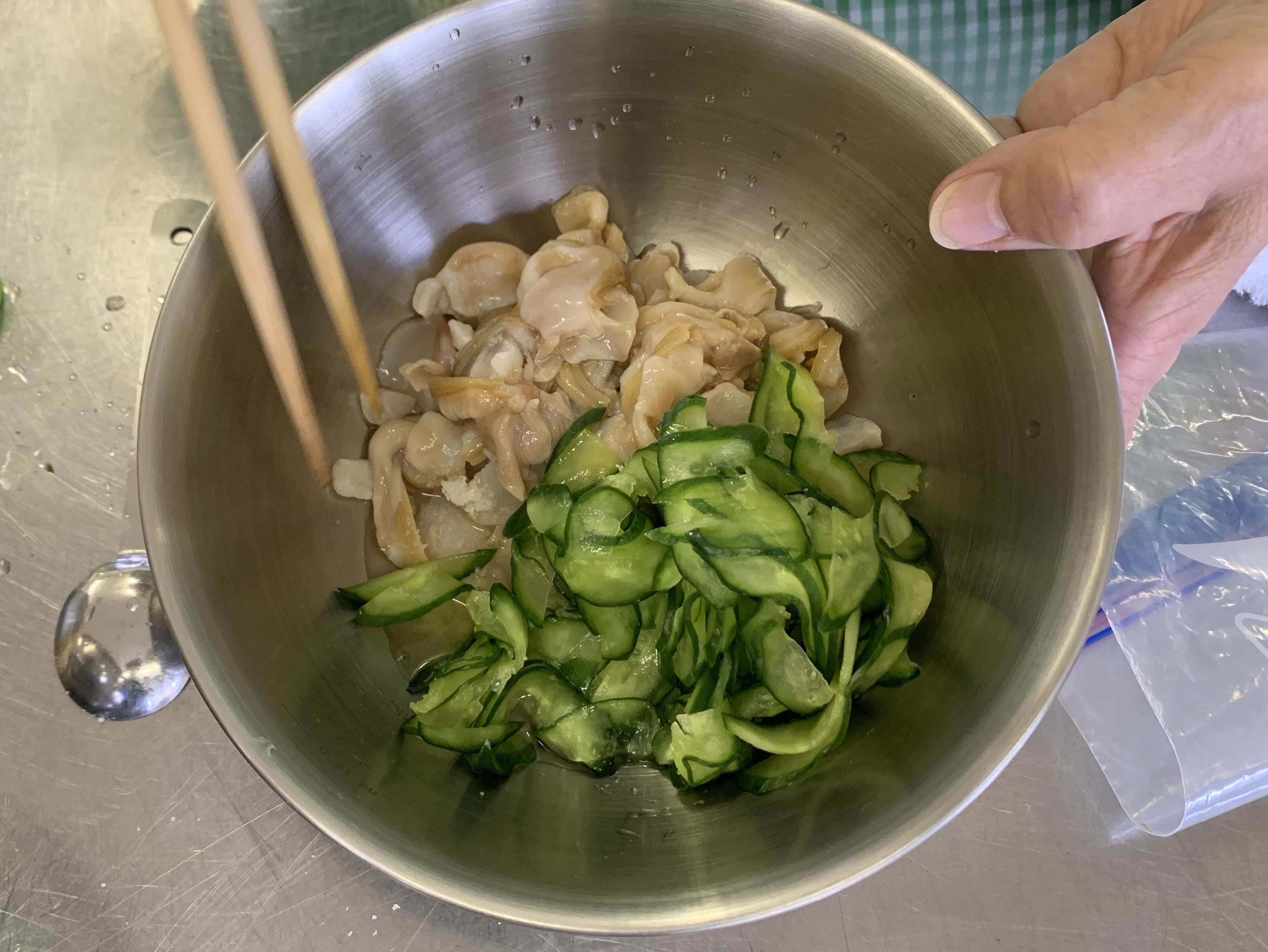 材料 ホッキ貝のひも きゅうり 三杯酢(酢大さじ3、、砂糖大さじ2、醤油大さじ1)