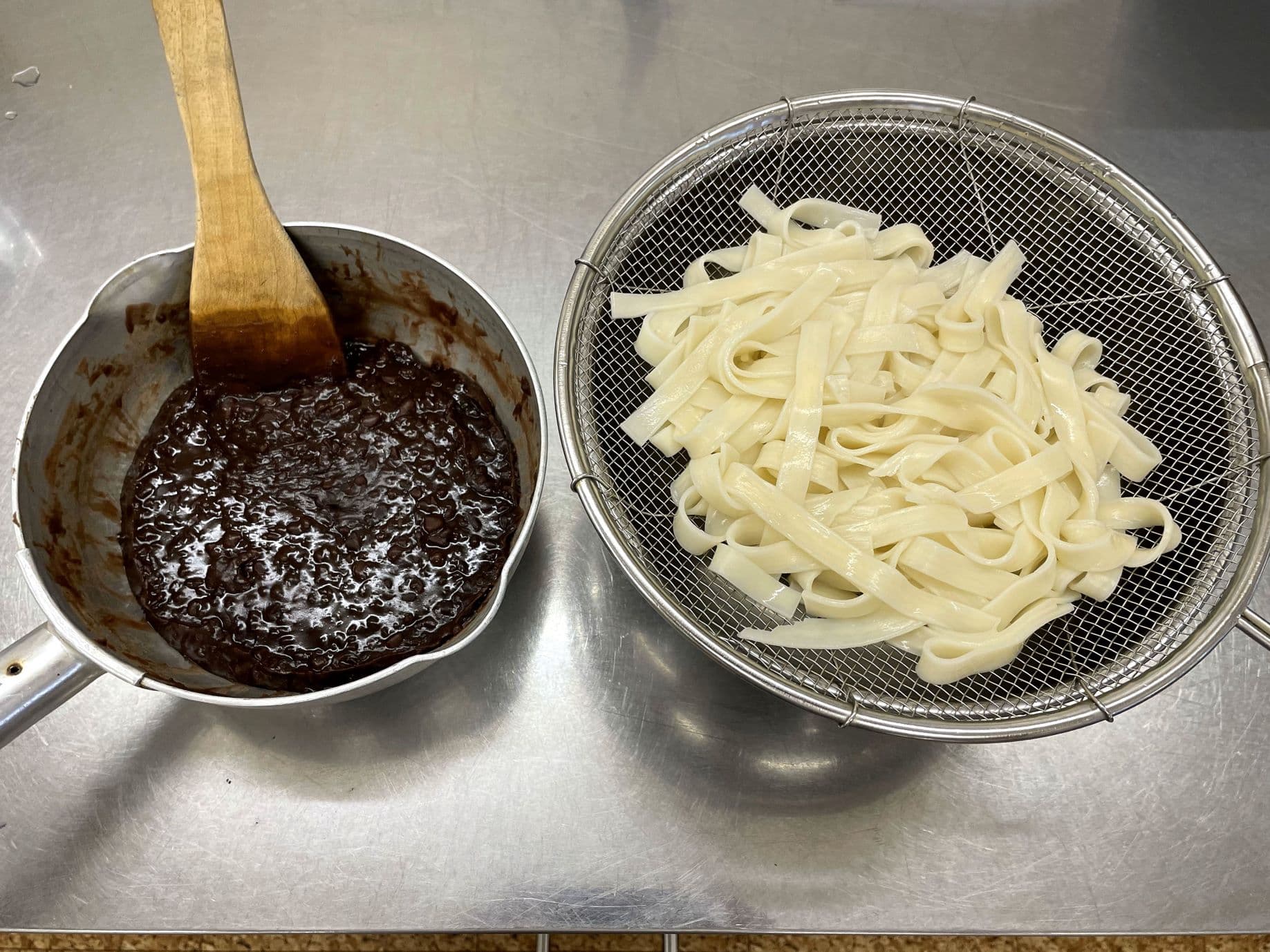 ②お椀に茹でたひもかわを入れ、あんを注ぐ。(鍋にあんと茹でたひもかわを入れて、少し煮て味を浸み込ませてもよい。)