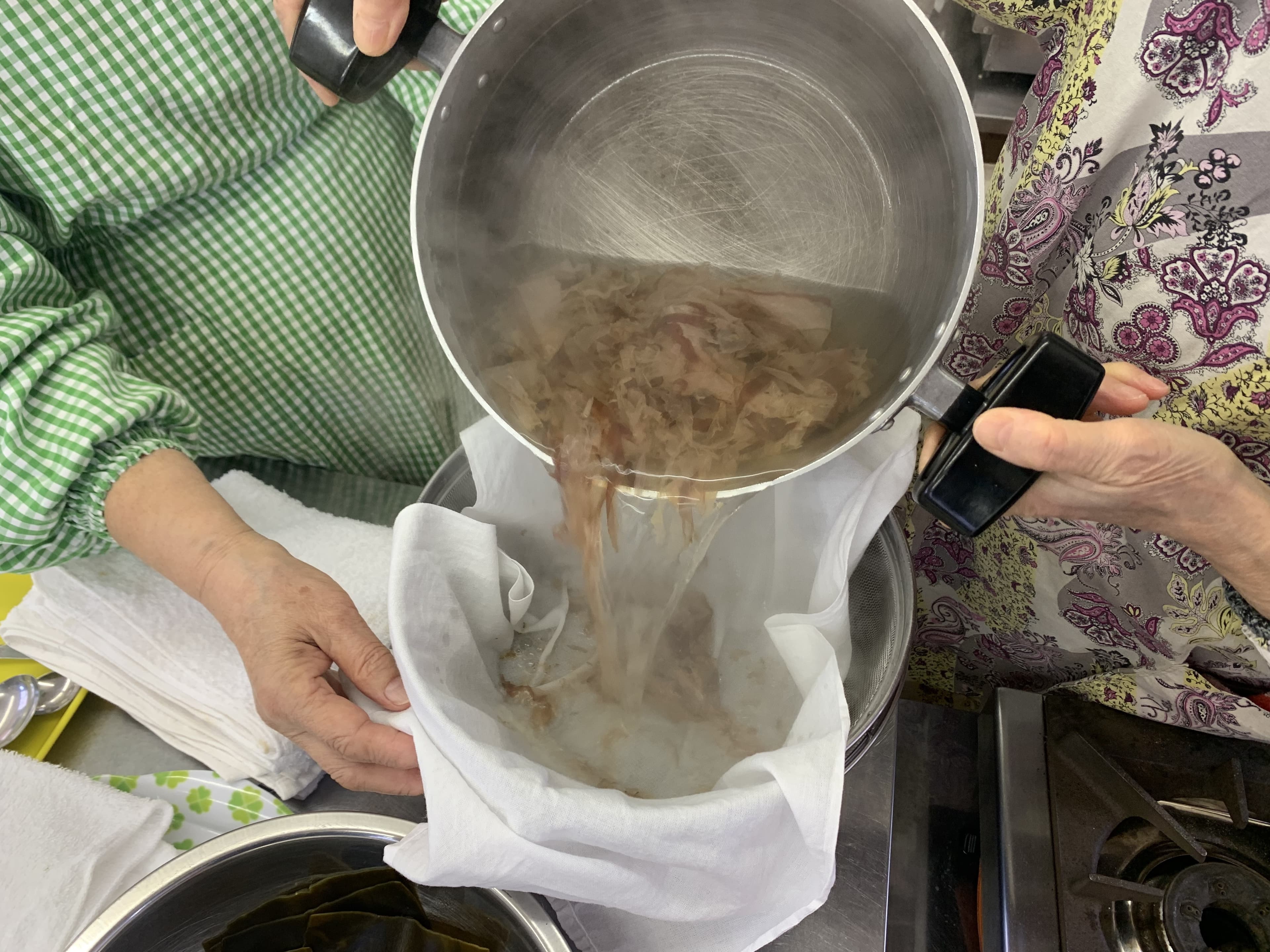 ②削り節を入れて沸騰する寸前に火を止め、削り節が沈んだら布巾でこす。