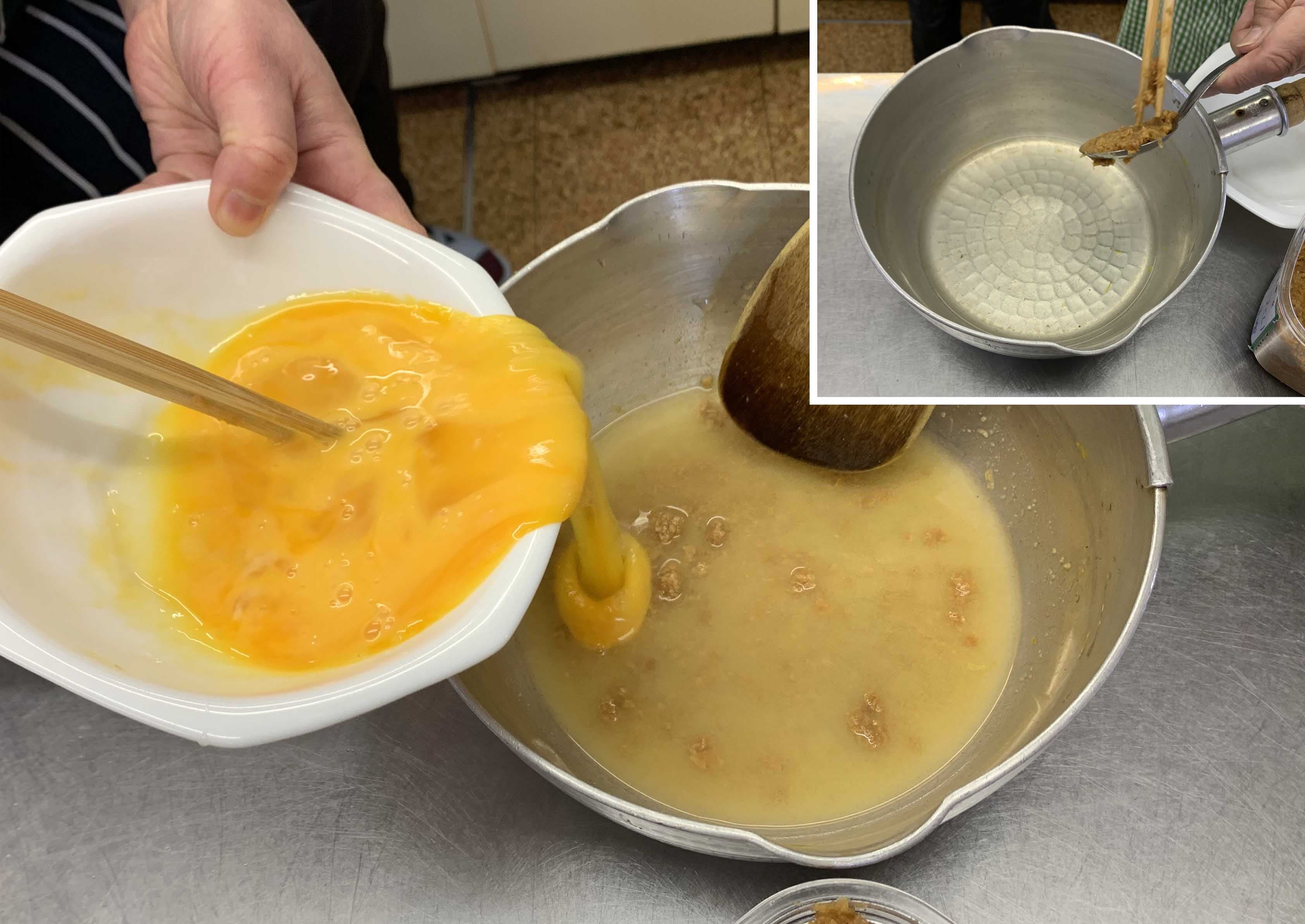 ④鍋にだしとみそを入れ溶かし、卵を入れてかき混ぜる。