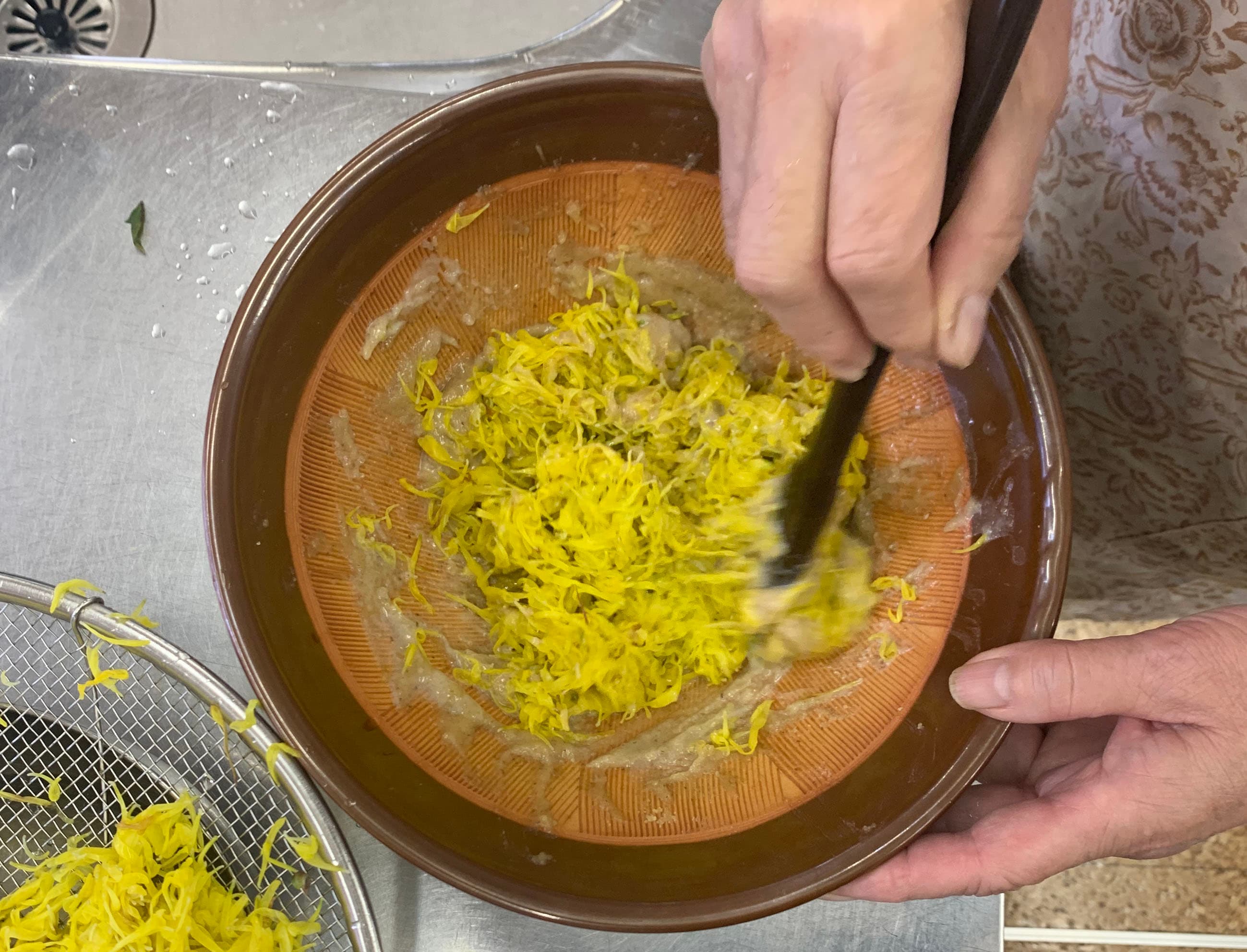 ①菊の花は、熱湯に酢を入れてさっとゆで、ザルに上げる。