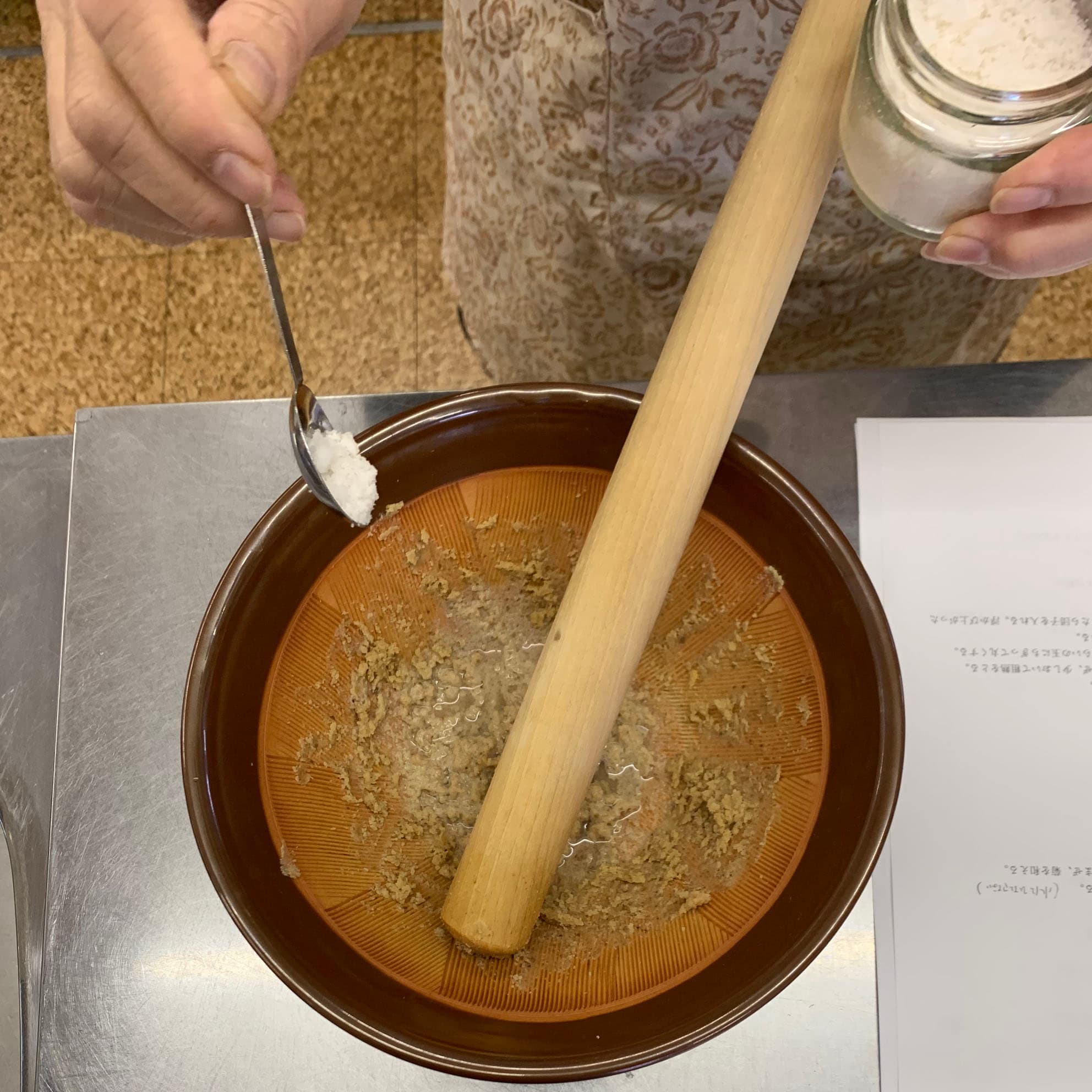 ②くるみはすり鉢でよくすり、出汁と調味料を入れて混ぜる。