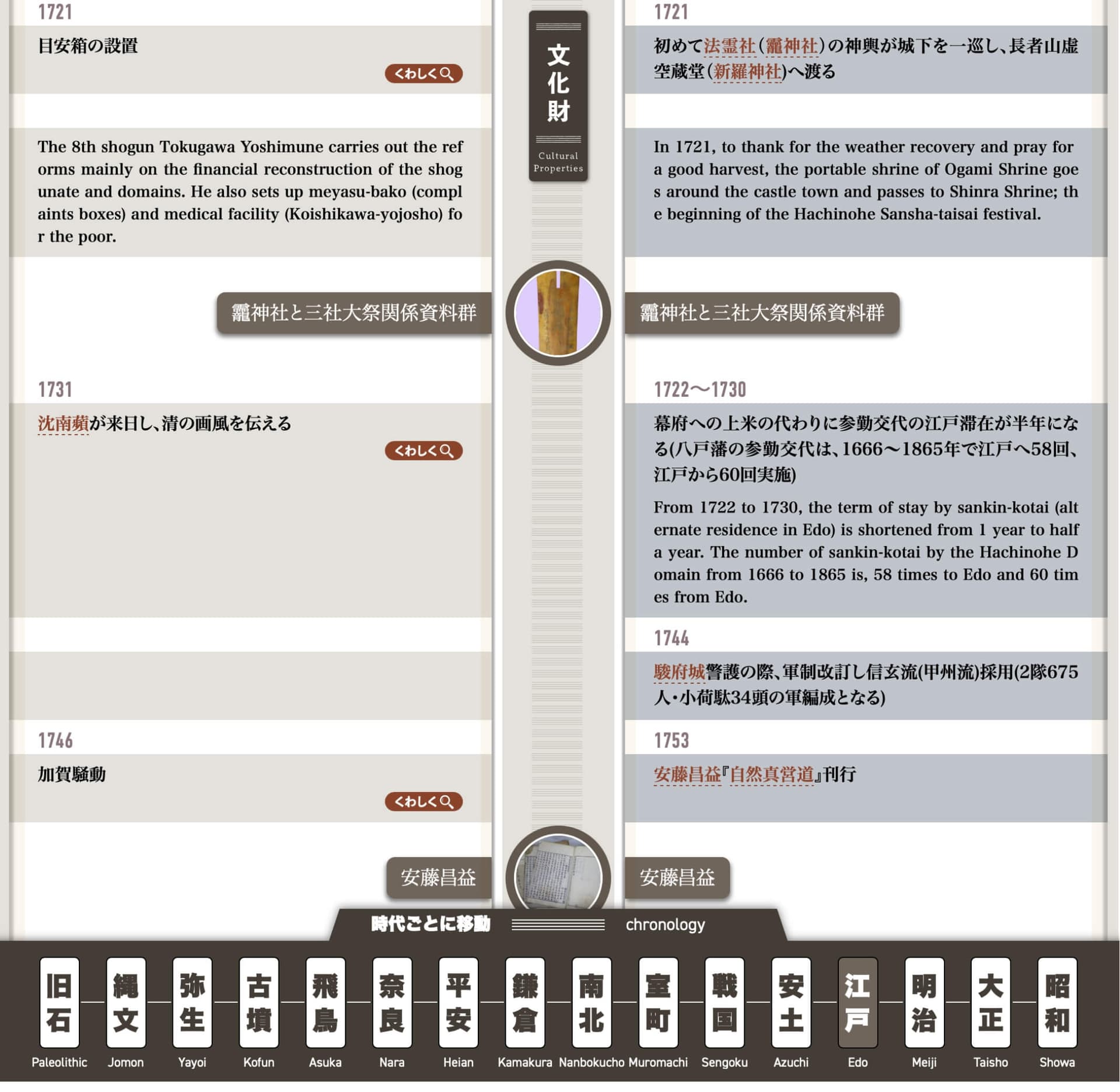 「日本の年表」「八戸の年表」をタップすると、旧石器時代~昭和まで約800項目の年表が表示されます。